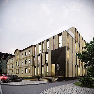 Pionowe osie podkreślono formatami okien i pasami muru, oblicowanego jasnym wapieniem, z którym skontrastowany został asymetryczny portal wejściowy, obłożony ciemnym kamieniem. Ten portal, razem z szerokimi schodami, tworzy odpowiednią oprawę wejścia do państwowej instytucji. Przeciwwagę dla reprezentacyjnych, zrytmizowanych elewacji stanowi wewnętrzne patio - całkowicie przeszklona, nastrojowo oświetlona przestrzeń, sprzyjająca spotkaniom zawodowym i prywatnym.