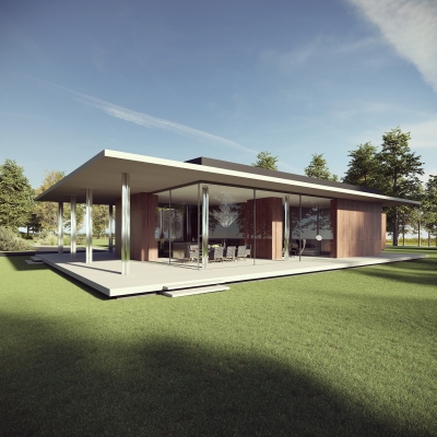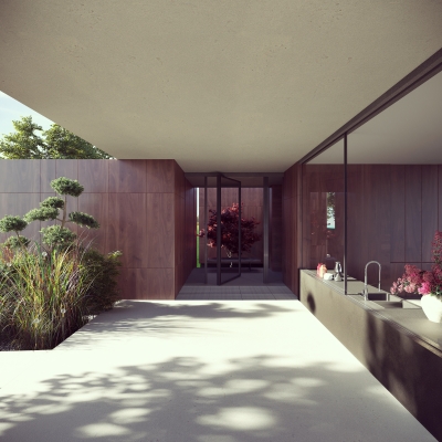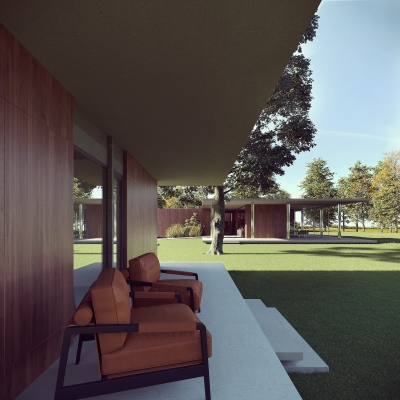 Na dużej działce rozplanowano dwabudynki, przesunięte względem siebie i połączone okręgiem podjazdu oraz krętąlinią ścieżki. Większy z nich to dom główny, z wyodrębnionymi trzema skrzydłami,natomiast drugi jest mniejszy, gospodarczy i kompaktowy. Obie, oddalone odsiebie bryły zachowują niezależność, ale nie tracą się z oczu – stąd starannieprzemyślane osie widokowe, rozmieszczenie okien, prowadzenie traktówkomunikacyjnych oraz wspólny, estetyczny mianownik.