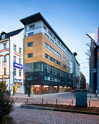 Harmonische, waagerechte Fassadenteilungen schaffen eine räumliche Ordnung und wirken positiv auf die Verbesserung des Aussehens dieser engen, Altstadtgasse. Dank der Verwendung von vielfältigen, hochqualitativen Steinverkleidung in Verbindung mit Glasflächen, wurde ein geeigneter Rahmen für Büros renommierter Firmen, die in der Altstadt ihren Sitzt haben, geschaffen. In der letzten Etage wurden moderne Appartements mit individuell gestalteten Innenräumen und der Aussicht auf die Altstadt von Breslau entworfen.
