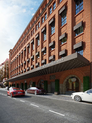und Ausbauprojekt von der ehemaligen Bäckerei in der Nähe vom ältesten Teil von Breslau, Dominsel: das wichtigste Gebäude dieses Komplexes ist ein alter Bau aus Ziegelsteinen aus dem Jahre 1914, also ehemaliges Verwaltungsgebäude des Breslauer Consum-Vereins, die für ein Hotel umgebaut und mit zwei neuen