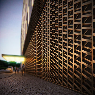 der gleichzeitig über den gesamten Bau dominiert und ein Erkennungsmerkmal bildet. Der Hotel- und Tagungsteil wurde visuell vom Wohnteil, der über freiere und mehr expressive Fassaden verfügt, abgetrennt. Das Hotel mit so harmonischen Proportionen und einer großen Skala benötigt eine sorgfältige Auswahl an Materialien, die seinen Rang und Bedeutung unterstreichen.
