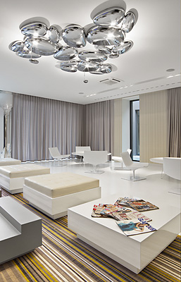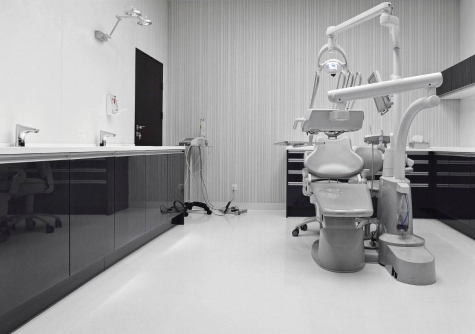 und Stahl ergänzt wurden. Einfache, sorgfältig ausgearbeitete Details stehen für die Sauberkeit, Präzision und Professionalismus. Über den Charakter des Ganzen entscheiden die Details: Lampen im Form von Quecksilbertropfen, als dem Hauptbestandteil von Amalgam, sowie silberne Stühle in Form von Zähnen, die dieser minimalistischen Form Leichtigkeit und Ungezwungenheit verleihen. Diese Stühle sind wie geschmackvoller Schmuck zu dem klassischen "kleinen Schwarzen".