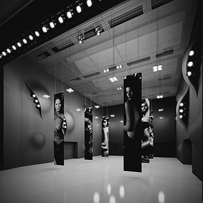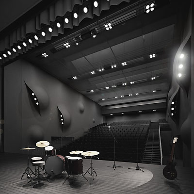 Der Saal für Unterhaltungsmusik ist gänzlich in samten Schwarz gehüllt und die Wandoberflächen wallen und damit werden zusätzliche Lichtquellen aufgedeckt. Der hintere Teil der Bühne kann zu einer mobilen Fotogalerie werden, die ein fester Bestandteil des Bühnenbildes eines Konzertes oder einer Jam Session sein kann.