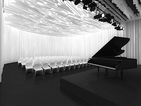 die neusten technologischen Lösungen angewandt. Die Konzertsäle wurden mit Beschallungs- und Beleuchtungssysteme ausgestattet, sowie auch mit modernen Designmöbeln. Aus der ideal weißen, leuchtenden Halle gelangt man in einzelne Räume, wie den hellen Saal der klassischen Musik, wo die weißen Wände und Decke durch den schwarzen Fußboden und das Podest, auf welchem das Klavier steht, ergänzt wurden.