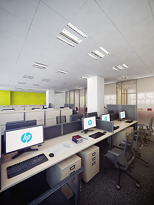 Moderner und funktioneller Bereich „Open Space“. Die Arbeitsplätze wurden durch niedrige Trennwände abgetrennt und die Konferenzräume durch Glasscheiben. Alle Arbeitsplätze sind gut beleuchtet, ergonomisch eingerichtet, mobil und mit hochqualitativen Geräten ausgestattet. Auf dem Hintergrund der Möbel in neutraler Farbgebung (helles Holz und Grau) bildet die energetische Wand in Limonefarbe einen starken Akzent: es ist ein wichtiges Erkennungsmerkmal, der den Büroräumen einen individuellen Charakter verleiht.