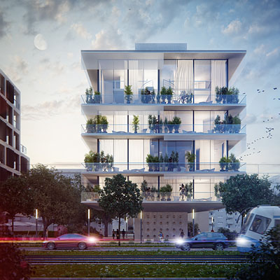 oraz zmianę funkcji. Panoramiczne przeszklenia zapewniają maksymalne doświetlenie, podkreślają wysokość pomieszczeń i sprawiają, że zanika granica między otoczeniem a wnętrzem. Każde mieszkanie ma duży taras –