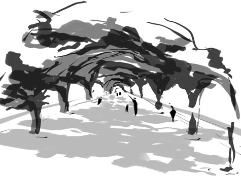 Ta świetlista struktura, w której zatarta została granica między poszczególnymi częściami konstrukcyjnymi, umożliwia dowolne kierunki ruchu i otwiera się na niezliczoną ilość perspektyw widokowych: z każdej strony i o każdej porze dnia prezentuje się równie ciekawie i atrakcyjnie, a w połączeniu z aleją drzew tworzy nastrojowy tunel światła i zieleni, stanowiący harmonijną i przyjazną przestrzeń publiczną.