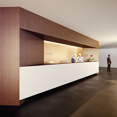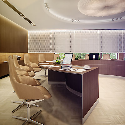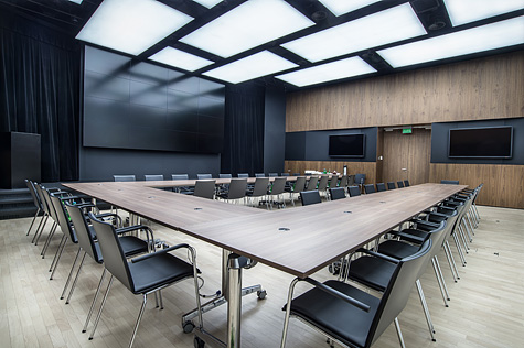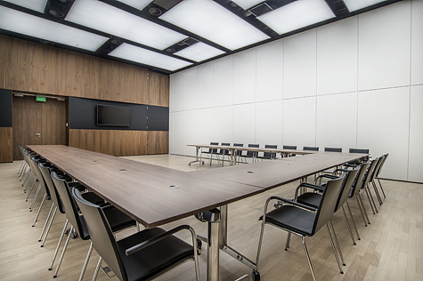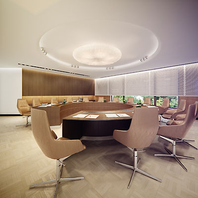 W reprezentacyjnych salach konferencyjnych odbywają się ważne spotkania z klientami, a w trakcie narad podejmowane są decyzje istotne dla całego przedsiębiorstwa. Dlatego te wnętrza cechuje nowoczesna elegancja, stosowanie wysokiej jakości materiałów wykończeniowych (drewniane okładziny ścian) oraz rezygnacja z typowo biurowych elementów wyposażenia na rzecz bardziej klasycznych detali (takich jak duży, dekoracyjny plafon, oświetlający owalny stół konferencyjny czy ażurowe rolety o powtarzalnym, geometrycznym wzorze). Wnętrza utrzymane są w jasnej kolorystyce, z przewagą bieli, brązów i złotawych odcieni beżu, nawiązujących do ciepłej barwy miedzi, a tym samym - do profilu firmy.