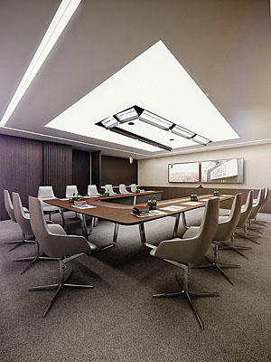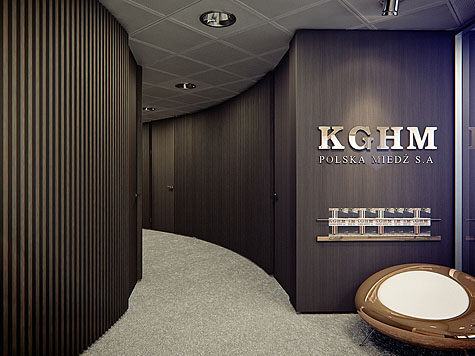do wideokonferencji i spotkań z dziennikarzami. Nietypowe materiały wykończeniowe (jedwabne i drewniane okładziny ścian), a także indywidualnie projektowane meble (lśniące fotele o organicznym kształcie) dodają biurowym wnętrzom nowoczesnej elegancji, wzbogacając wizerunek solidnego przedsiębiorstwa o element oryginalności i kreatywności.